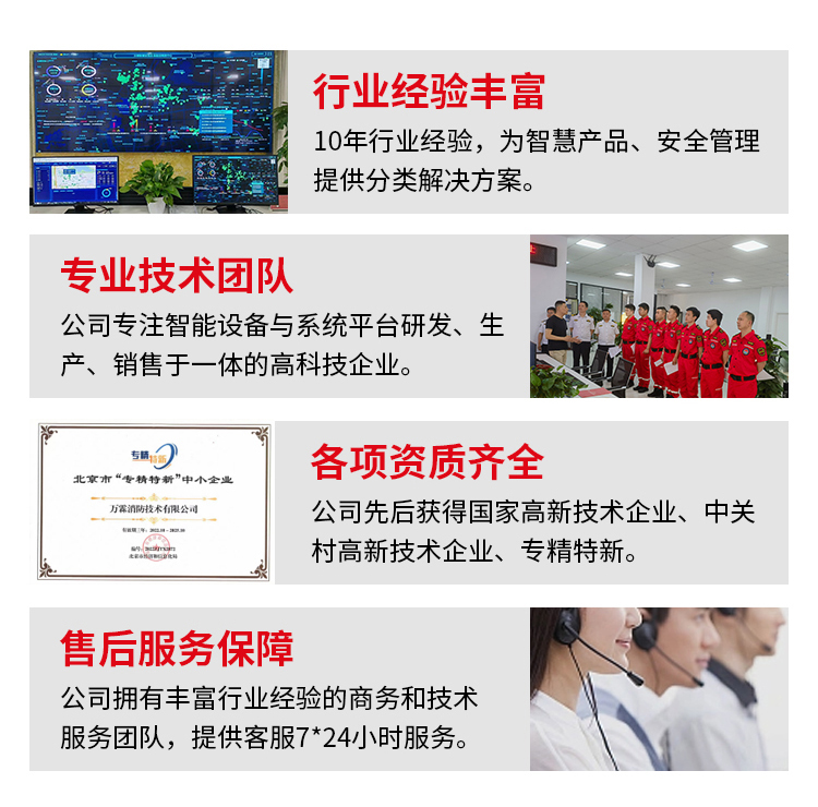 万霖消防技术有限公司是一家致力于运用物联网、云计算、大数据、地理信息等技术,为智慧消防、安全管理提供分类解决方案的高科技企业。基于消防物联网技术,万霖智慧采用“感、传、知、用”等物联网技术手段,实现“烟、气、水、电、网”全系列可联网智能终端设备与智慧消防云服务平台。十年的消防行业深耕,可提供完整的消防重点防火单位、九小场所智慧消防远程监管运营服务模式,安消一体化视频联动平台系统,颠覆智慧消防传统运营模式的创新。